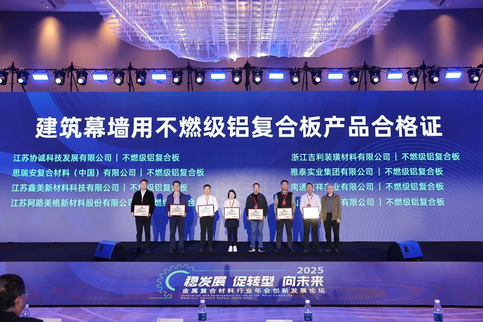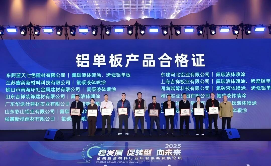 雅泰實業(yè)集團參加本次年會,會上,集團的氟碳液體噴涂鋁單板、不燃級鋁復(fù)合板、鋁波紋芯復(fù)合鋁板等產(chǎn)品分別榮獲“新國標(biāo),高質(zhì)量”產(chǎn)品合格證。