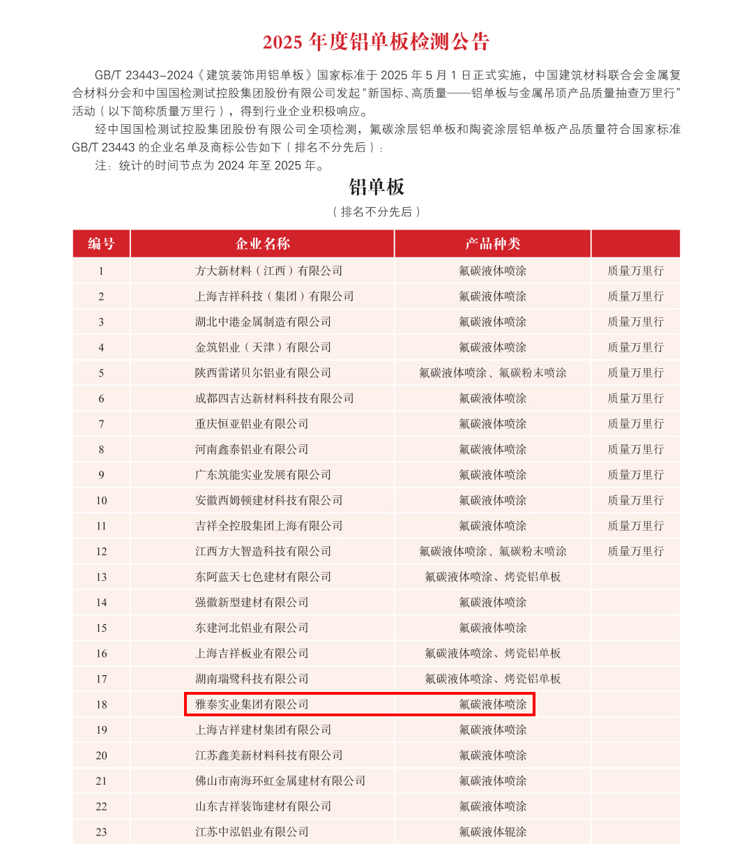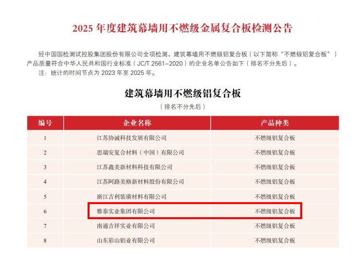 為加強金屬復合材料行業(yè)品質建設,提高行業(yè)整體質量,金屬復合材料分會聯(lián)合中國國檢測試控股集團股份有限公司對符合全項檢測要求的鋁塑復合板、鋁單板、建筑裝飾用不燃級金屬復合板、鋁蜂窩復合板和鋁波紋芯復合鋁板等生產(chǎn)企業(yè)頒發(fā)2025 年度產(chǎn)品合格證,具體公告如下: