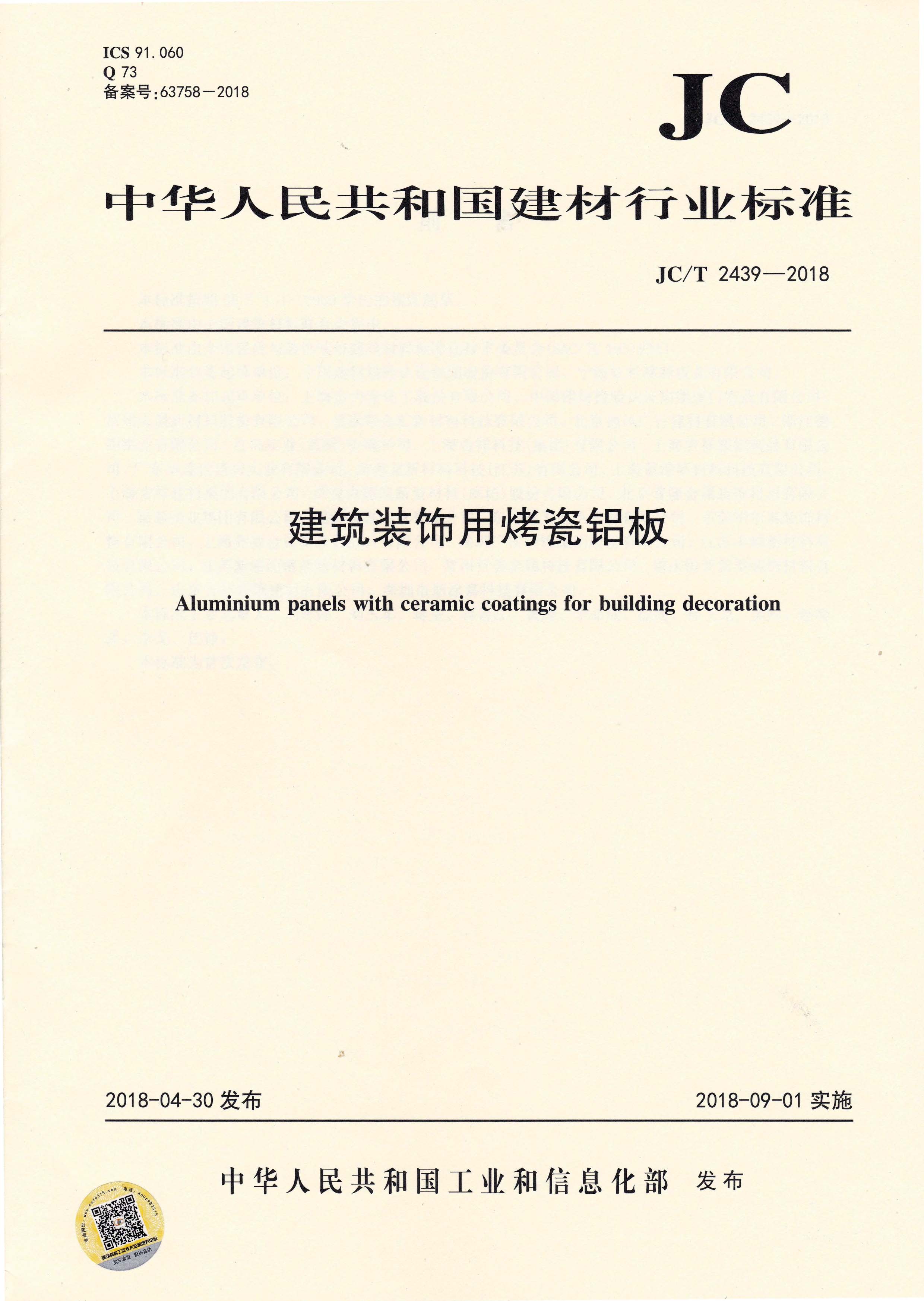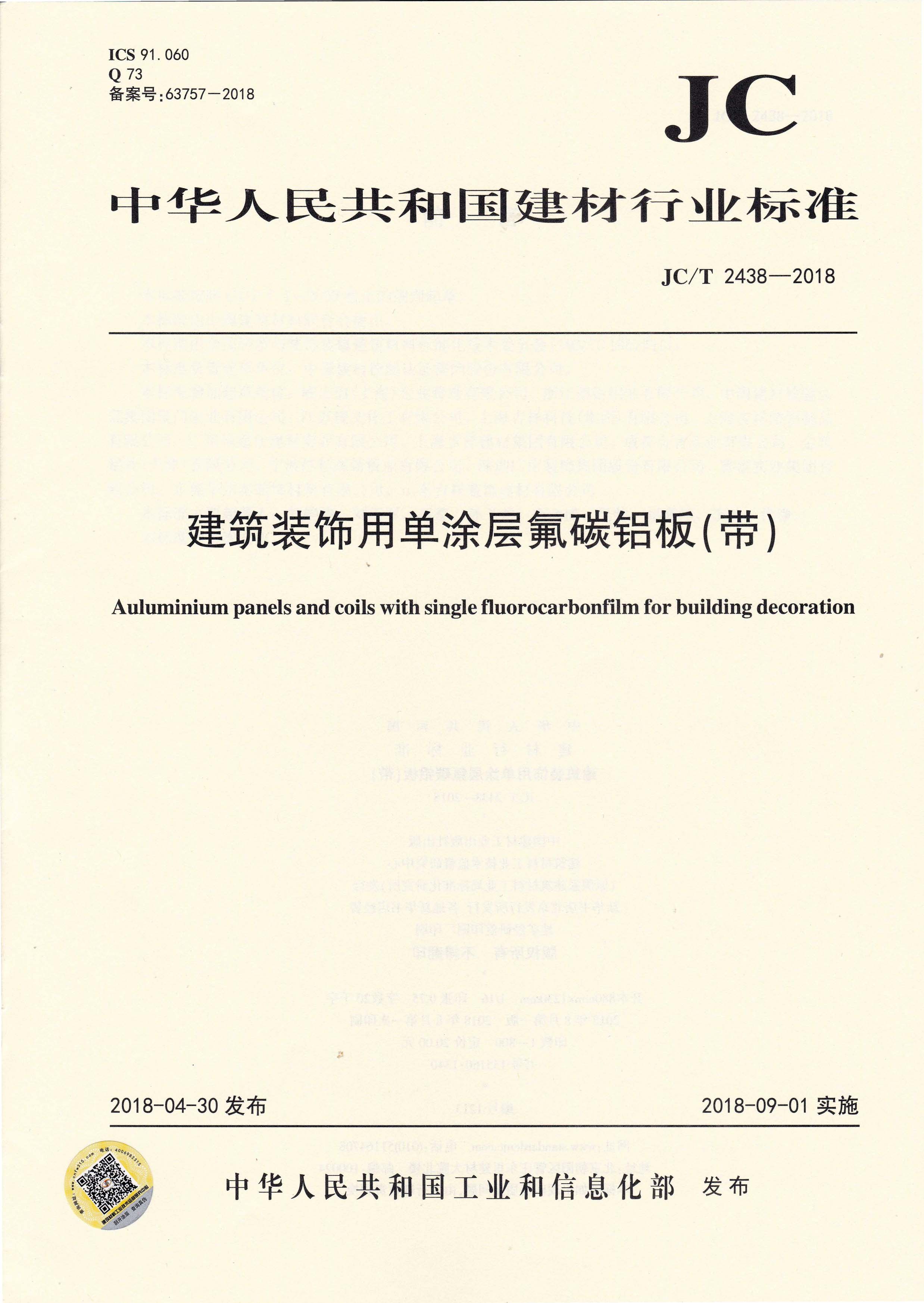 近日,由中國建筑材料聯(lián)合會(huì)提出,雅泰實(shí)業(yè)集團(tuán)有限公司參與起草的JC/T 2439-2018《建筑裝飾用烤瓷鋁板》、JC/T 2438-2018《建筑裝飾用單涂層氟碳鋁板(帶)》兩項(xiàng)行業(yè)標(biāo)準(zhǔn)于2018年4月30日首次發(fā)布,2018年9月1日起正式實(shí)施。