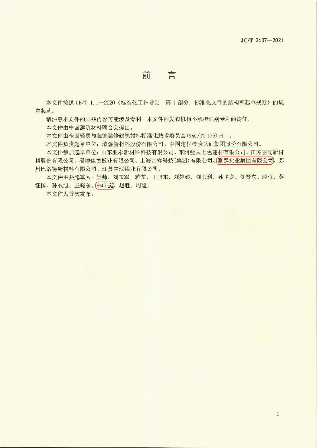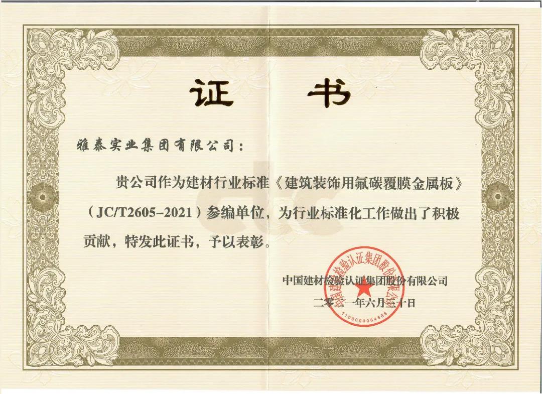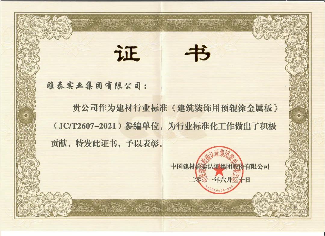 近日,由中國建筑材料聯(lián)合會(huì)提出,雅泰實(shí)業(yè)集團(tuán)參與起草的《JC/T2605-2021建筑裝飾用氟碳覆膜金屬板》、《JC/T2607-2021建筑屋面用預(yù)輥涂金屬板》兩項(xiàng)行業(yè)標(biāo)準(zhǔn)于2021年3月5日發(fā)布,同年7月1日正式實(shí)施,公司技術(shù)部經(jīng)理林葉挺為此次兩項(xiàng)行業(yè)標(biāo)準(zhǔn)的主要起草人之一。