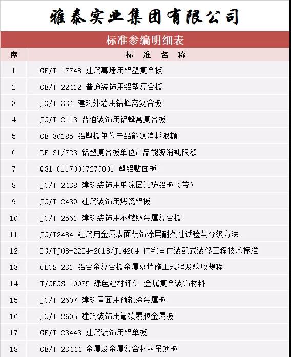 截至目前,雅泰作為參編單位參與國家標(biāo)準(zhǔn)、行業(yè)標(biāo)準(zhǔn)等各項(xiàng)標(biāo)準(zhǔn)共計(jì) 18 項(xiàng)(詳見參編標(biāo)準(zhǔn)一覽表),逐漸成為行業(yè)推進(jìn)標(biāo)準(zhǔn)化工作的主力軍之一,不斷證明公司地位及整體生產(chǎn)水品、產(chǎn)品實(shí)力等已得到業(yè)內(nèi)認(rèn)可。