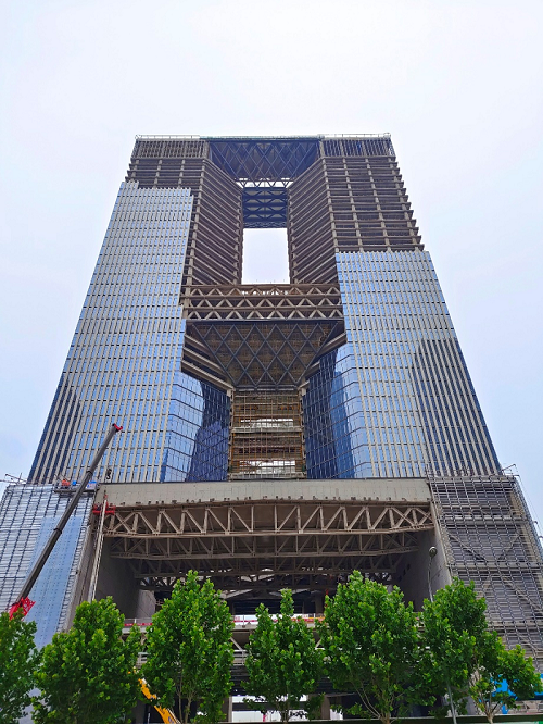該工程由中國建筑第八工程局有限公司承建,雅泰實業(yè)集團(tuán)承接外墻裝飾部分材料供材約40000平方米。項目體量大、工期短,目前工程全面進(jìn)入外墻裝飾階段,集團(tuán)全力保障該項目的供材,預(yù)計10月完成外幕墻全部封閉。封閉后可以完整地看到大廈上部呈現(xiàn)為一個雄偉的大門,彰顯國家對信息建設(shè)的信心和決心,“信息之門”由此而來。